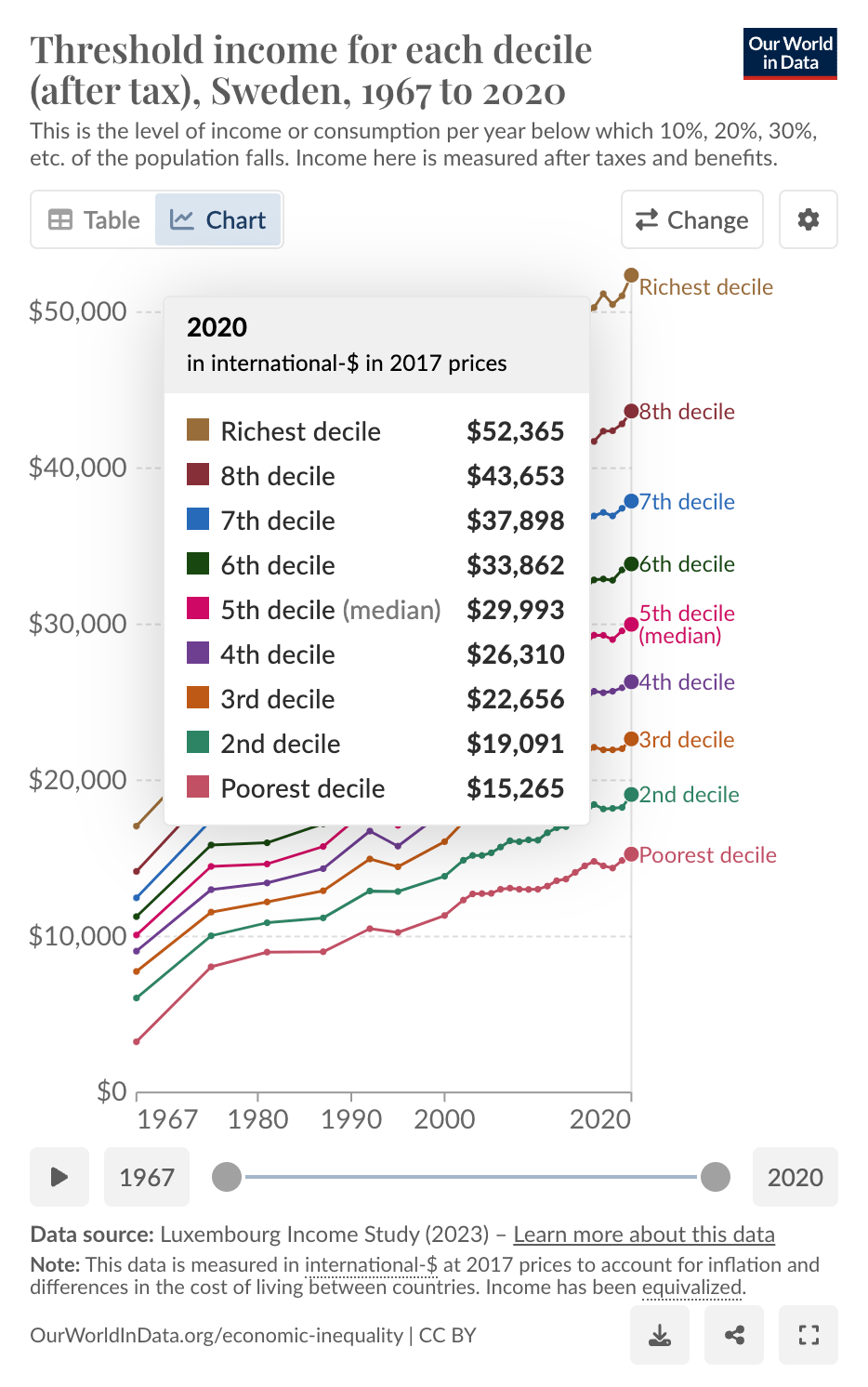 Our World in Data tracks inflation and currency-adjusted income deciles for our example countries: