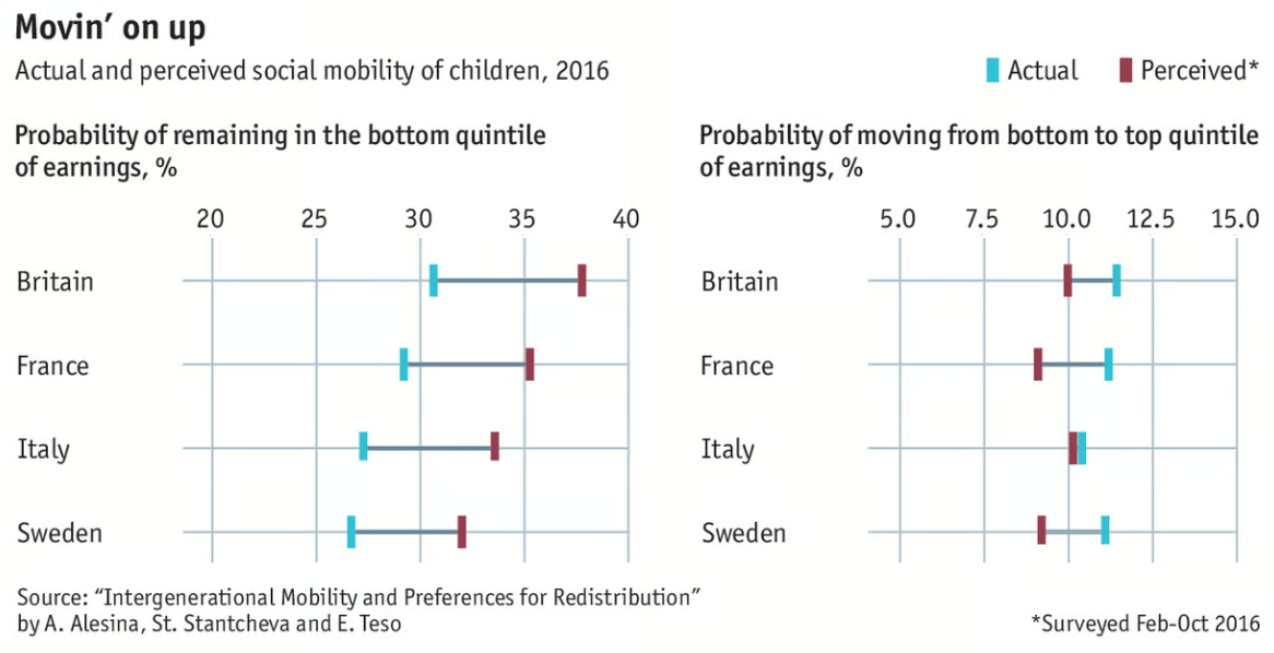 Since then, poverty rates have tumbled, wages have risen, and millennia-old barriers preventing class mobility have largely dissolved. Being born lower class is still a disadvantage, but it’s no longer a prison sentence. Still, despite these improvements over the last 70 years, poor citizens in most countries remain pessimistic about their chances of climbing from poor to rich. It’s tough to ignore 1,000 years of the Ancien Régime, I suppose, and this data is reflected in a Harvard study of perceived and actual social mobility in different countries:
