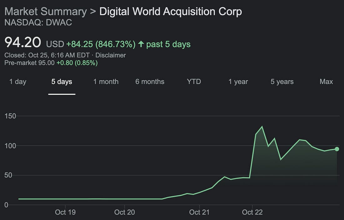On Wednesday, Digital World Acquisition Company (DWAC) was $10 per share. That night, this SPAC announced that it was taking Donald Trump’s media group public. DWAC was $175 a share on Friday morning. Post-merger, this is a $33 billion valuation for a media entity that doesn’t even have a functional platform.