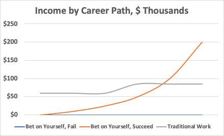 Betting on yourself is more than choosing a high risk, high reward over the alternative. Betting on yourself is an asymmetrical bet. The worst case scenario of striking out on your own in making $0. Even if you never make a dollar, you’ll gain invaluable experience that will help you land another job. If you’re young and have no dependents, the risk in taking a risk is almost nonexistent.