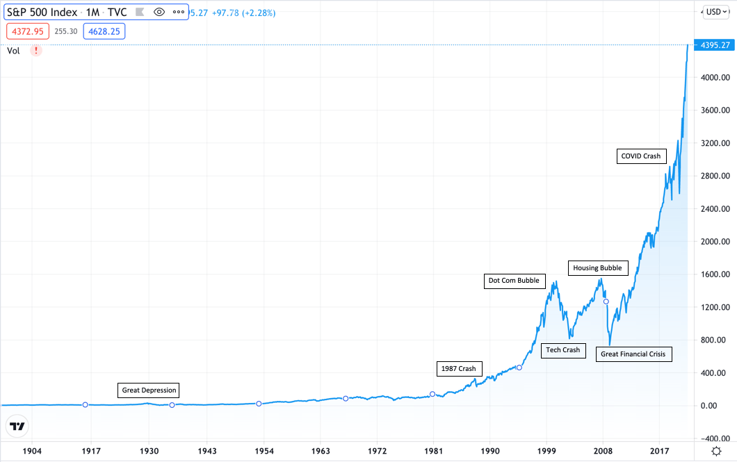 LOL what dip? In 15 months, the market went up by 100%. Assuming that you stayed invested, your money has now doubled since the pandemic lows. While the speed of 2020’s crash and rebound was rare, the end result was par for the course. Look at the S&P 500 from 1900 to now.