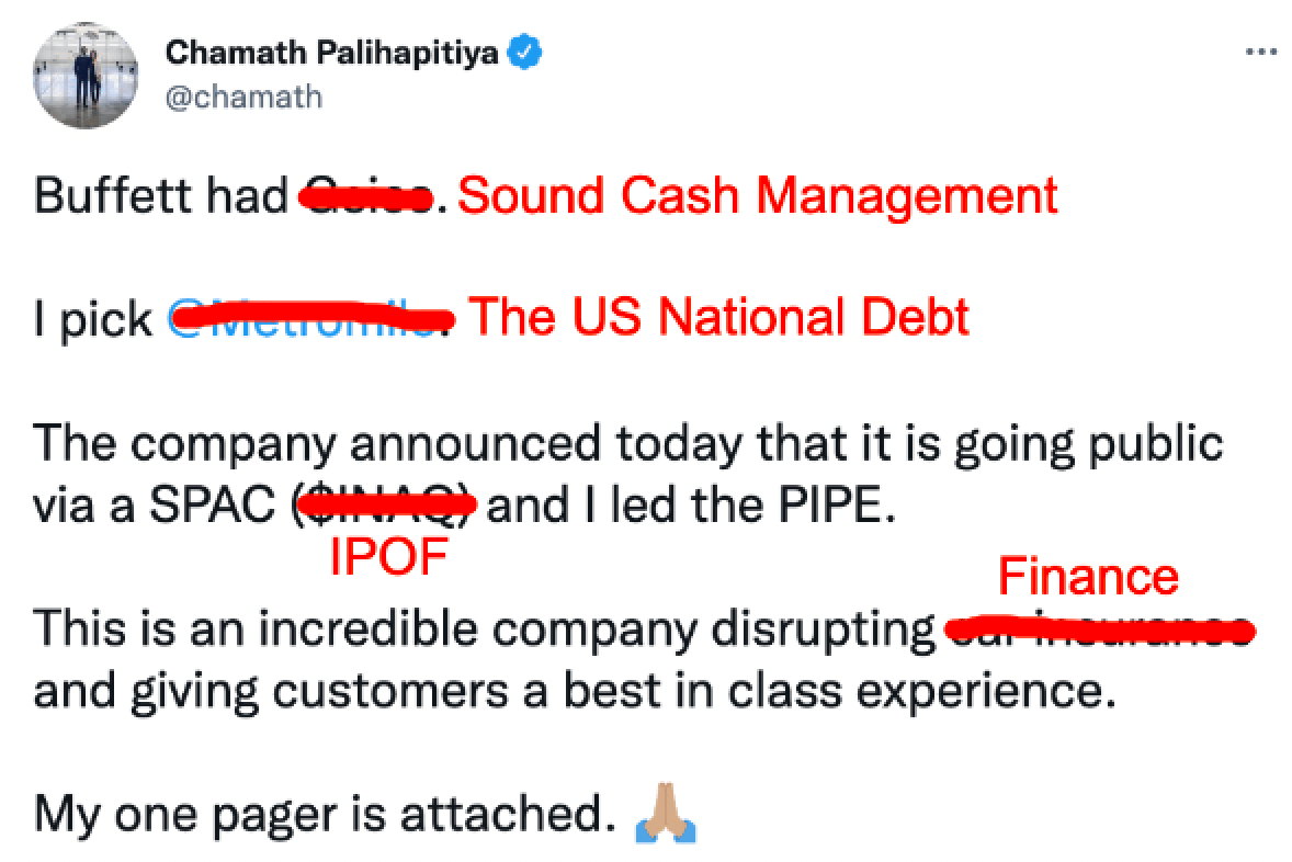 Chamath: Haha, very funny Jerome. I have a proposal for you. I want to take the US National Debt public through my SPAC: IPOF.